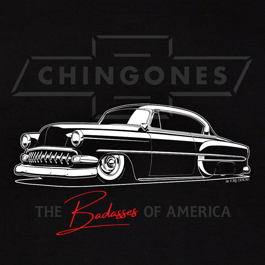 Here we have the 2nd design in the Chingones line, a sweet 1954 Chevy Bel Air hardtop that is layed the f' out! The 'CHINGONES' emblem is in the back ground. "The Badasses of America!!!"