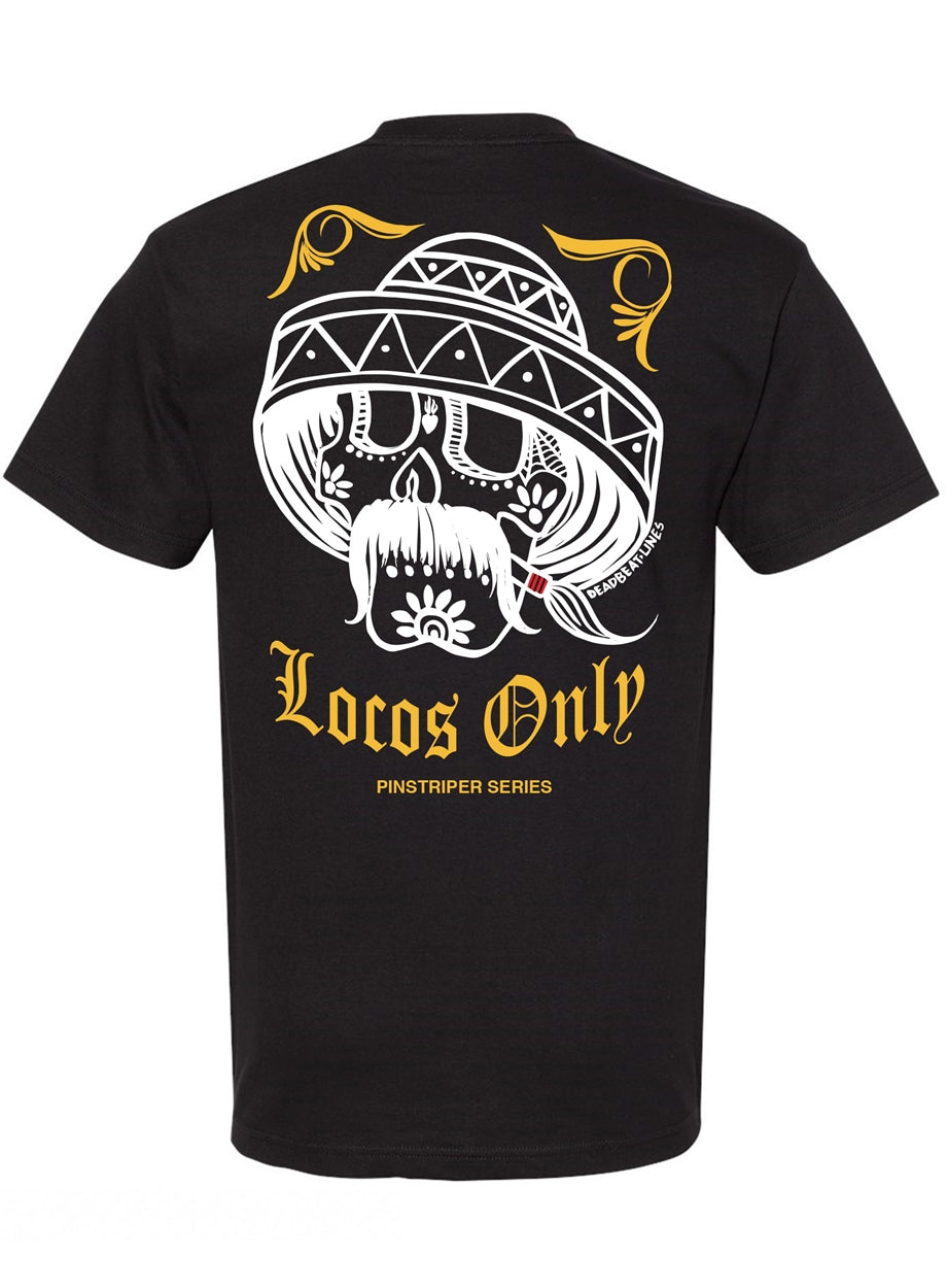 A classic design revisited. Design is in gold and white on the front and on the back. The back has the full design with just a touch of red on the pinstripe brush/cigarette. On a black tee. Locos Only!