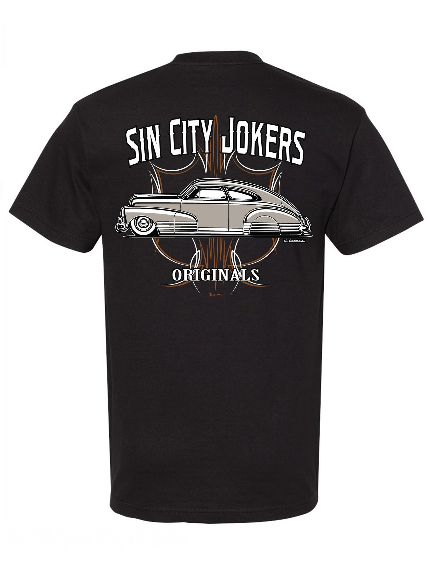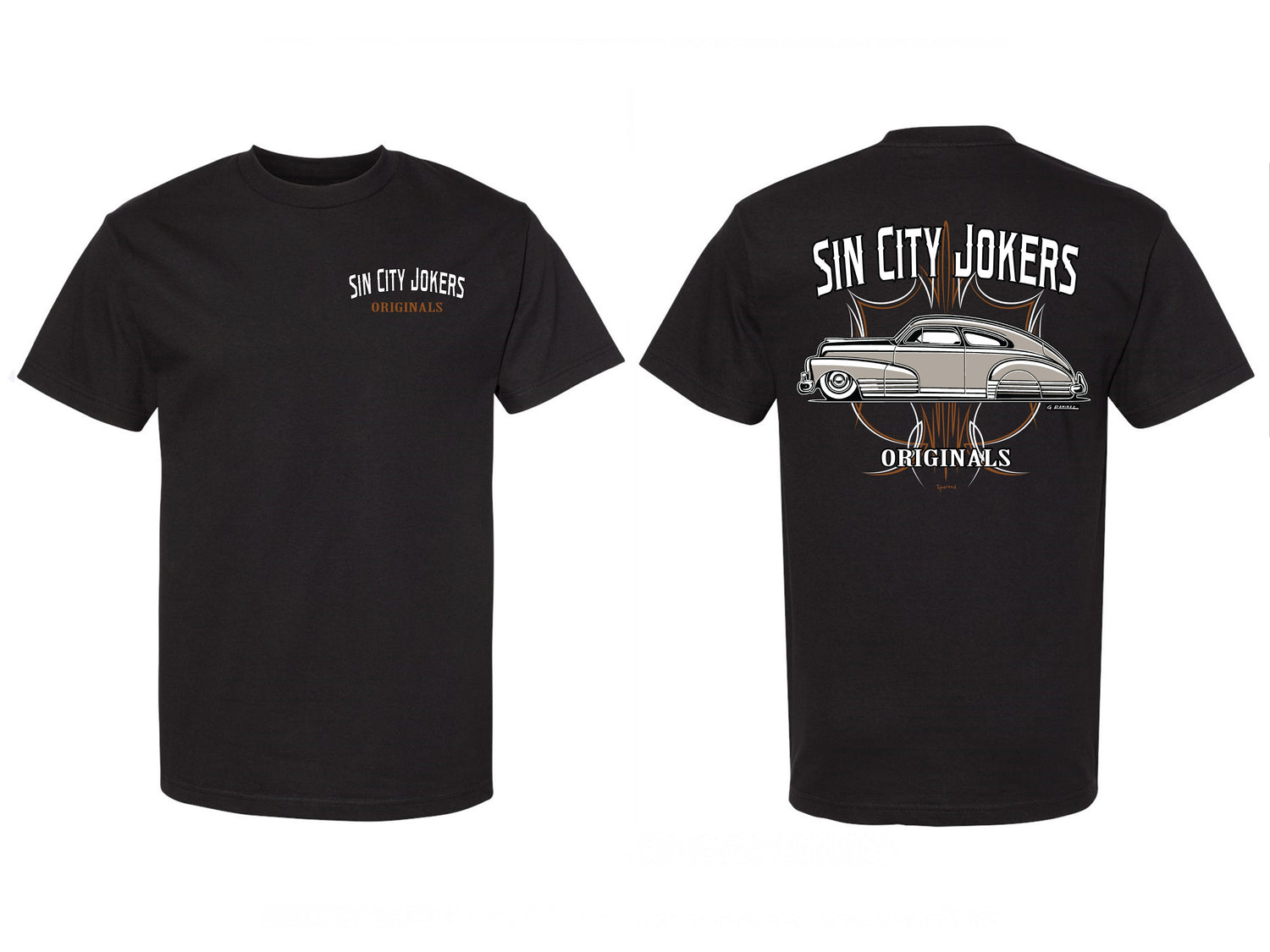 We've updated this classic with a new color scheme and we dig it!!! A collaboration between Sin City Jokers Clothing Co., kustom pinstriper Shaun Hartman and graphic artist Lupe Ramirez. This design has all the special elements to make this piece timeless. You'll dig it for years to come!