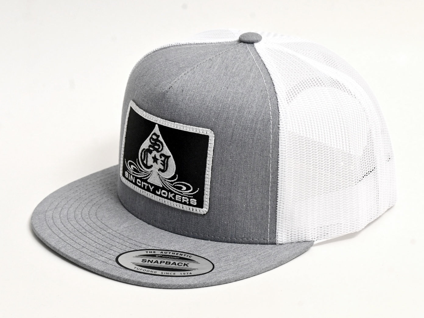 The SCJ Pinstripe Spade trucker snapback hats are of a higher quality mesh with a flat bill. 'Pinstripe Spade' patch is sewn on to the hat. No worries about it ever peeling off. Nice!!!